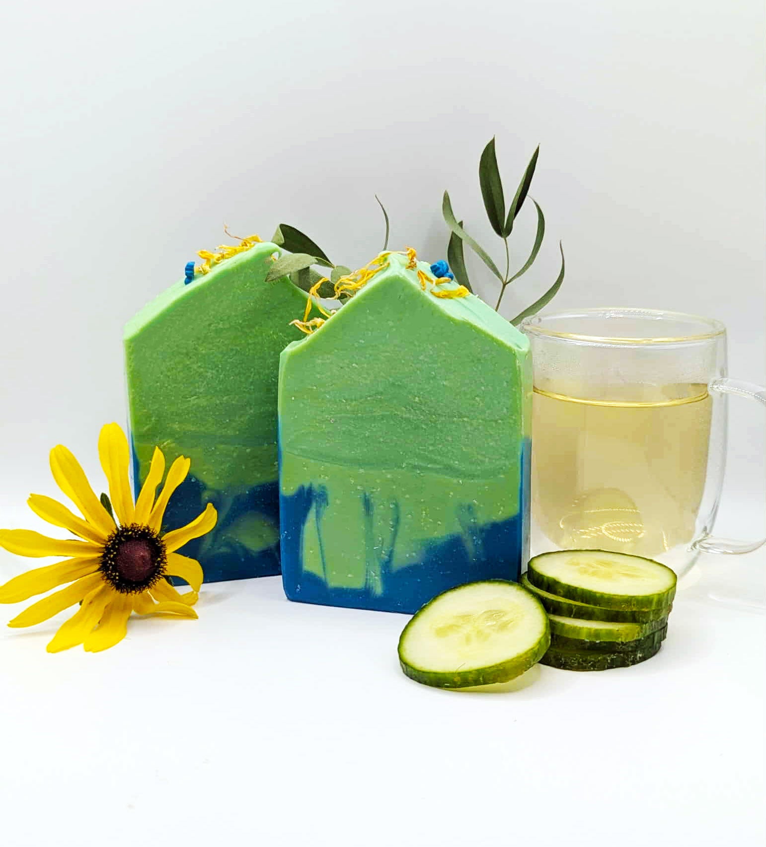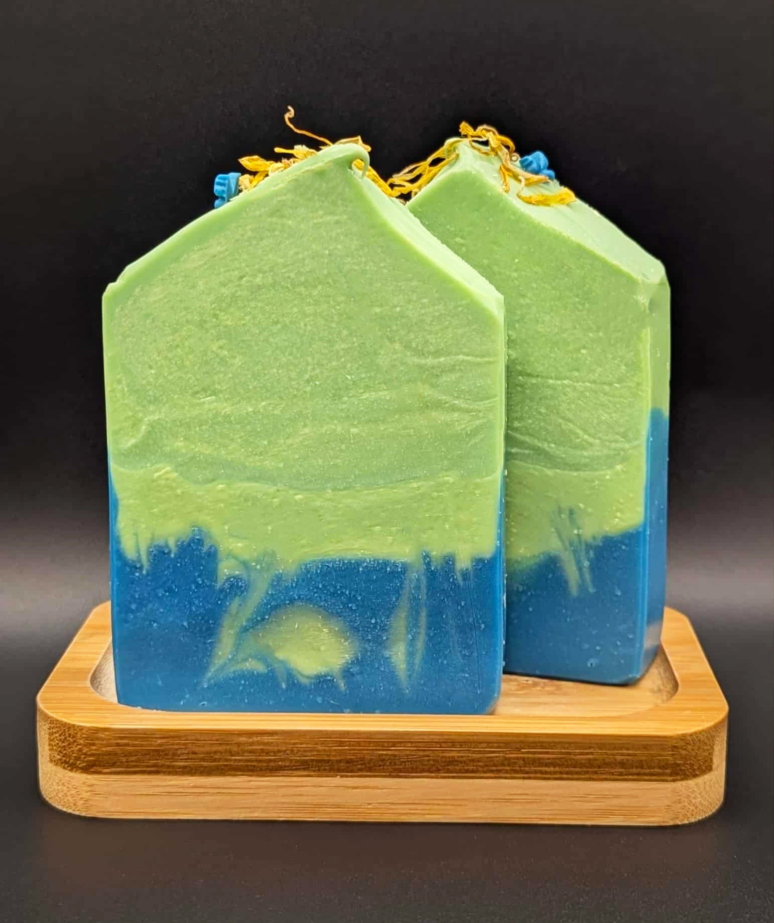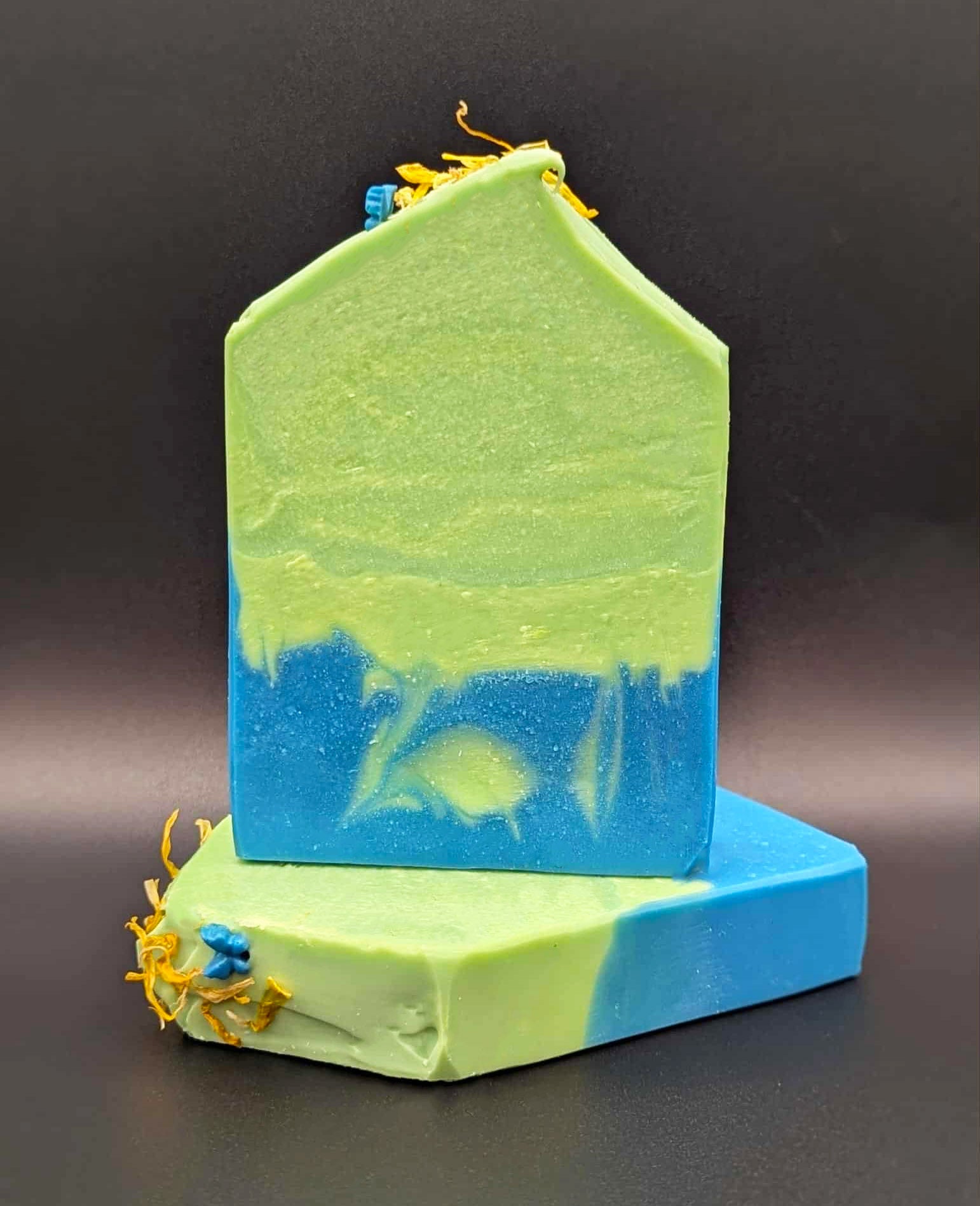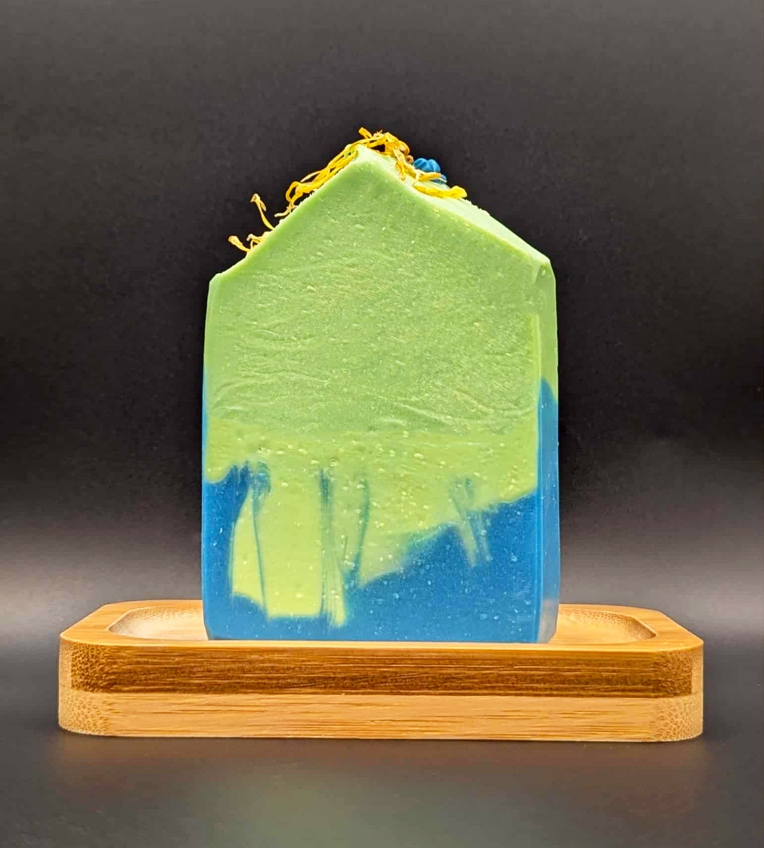 Debut is a sunny meadow gleaming with the wildflowers and sunshine of youth. Bright and refreshing notes of bamboo and cucumber are grounded with the still bright but earthy scents of sandalwood and patchouli. The colors of this bar are reflective of the Debut album cover, with a small butterfly among the calendula petals on top. I’ll be 87 you’ll be 89 and I’ll still look at you like the stars that shine.